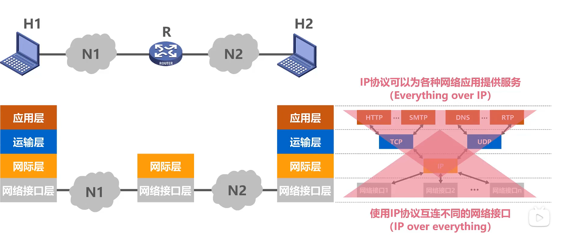 例子:N2传输http请求报文给N2。一层层加和转变成为比特流,然后到路由器,路由器分析到ip地址后又转变成比特流,然后根据地址给正确的N1. N1分析后又把比特流转成http请求报文。