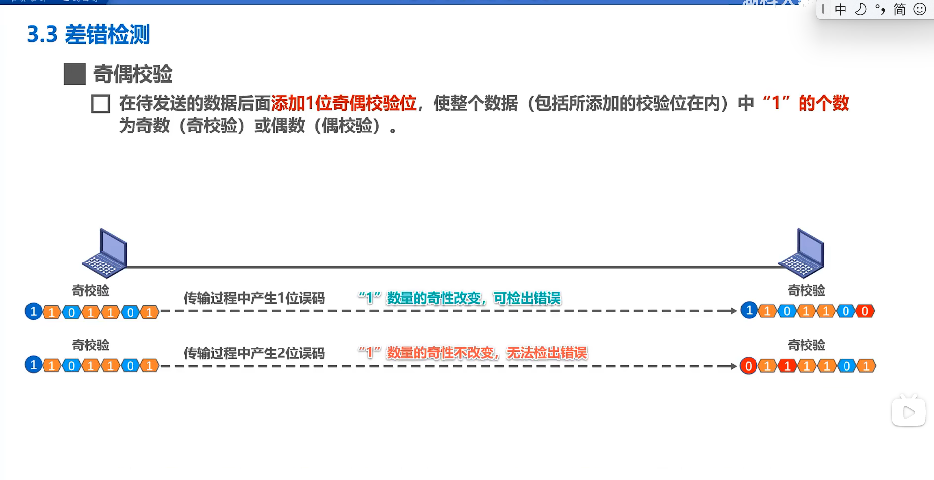 法一:奇偶校验:主机一个主机二规定0,1的个数为奇数或者偶数,如果有误,奇数偶数发生变化,那么就知道出现了误码。但如果正好出现2个误码,就没有改变奇偶性,则无法辨别是否出现误码。
