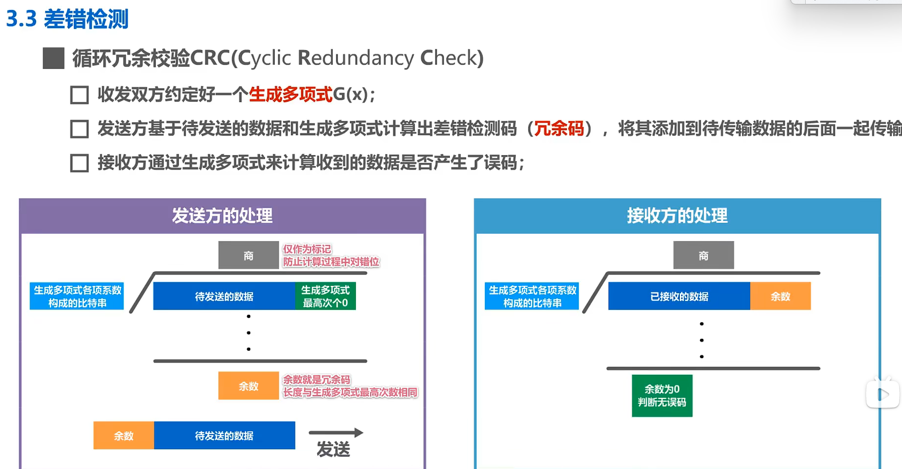 法二:循环冗余校验:发送方用发送数据生产多项式,然后放在传输数据后一起传输。接收方也生成多项式计算收到数据是否有误码。