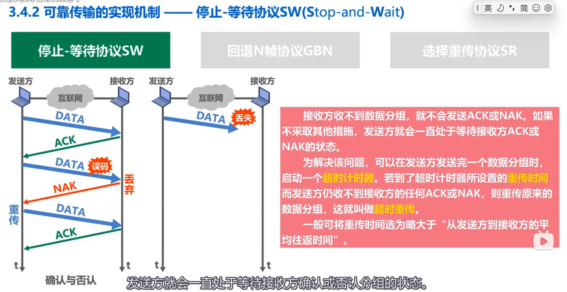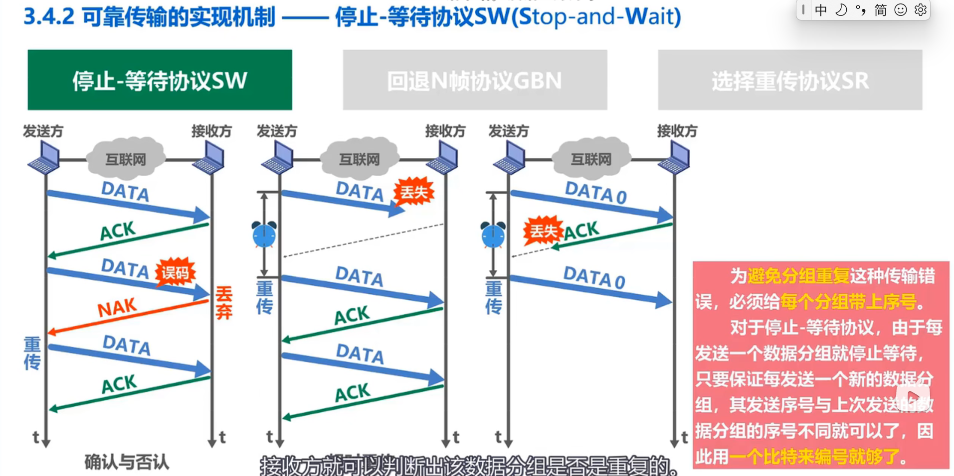 情况3:当接收方发送的ACK或者NAK丢失。这时候给每个Data加上数字编号,就可以防止重复传输