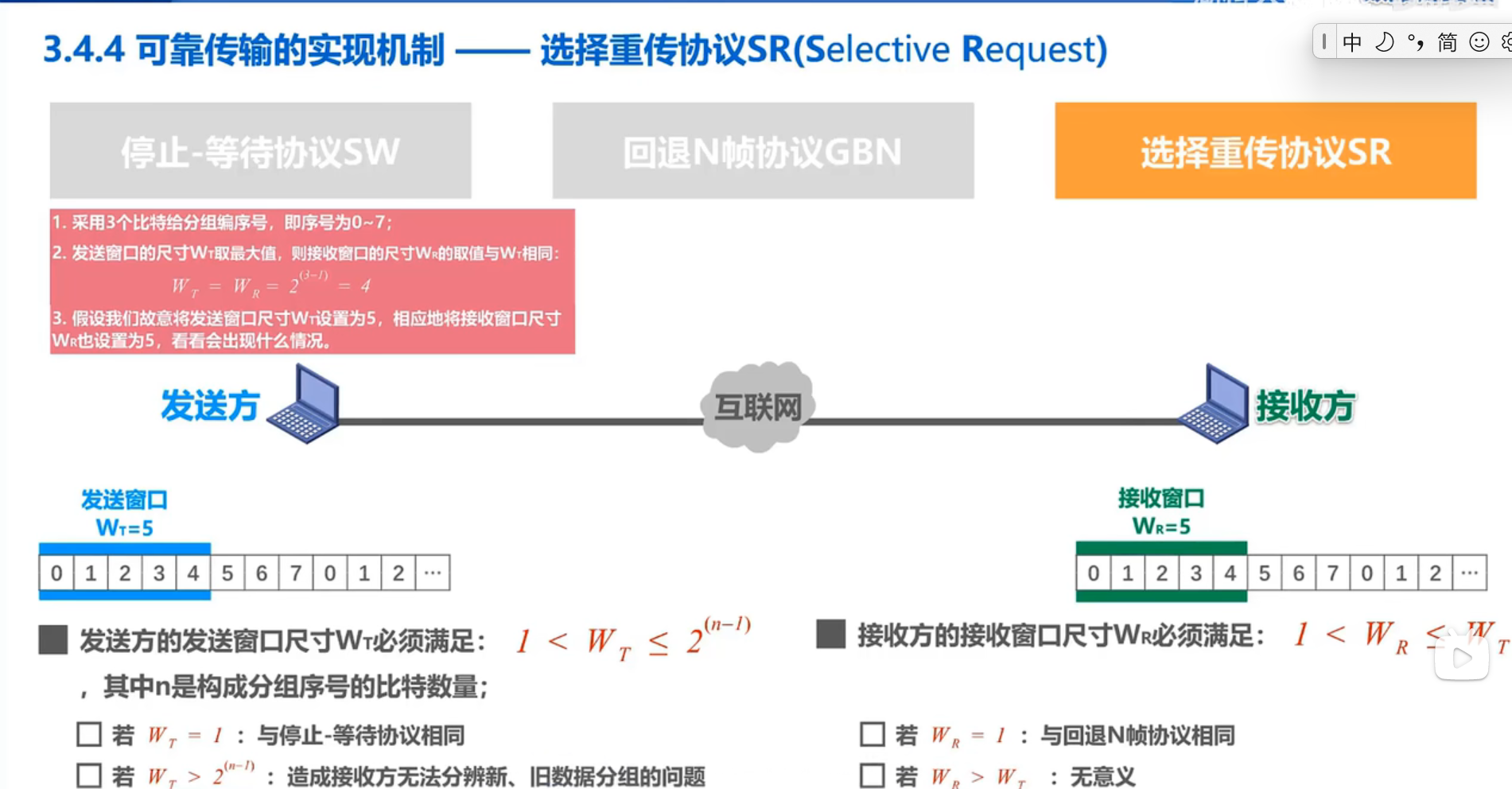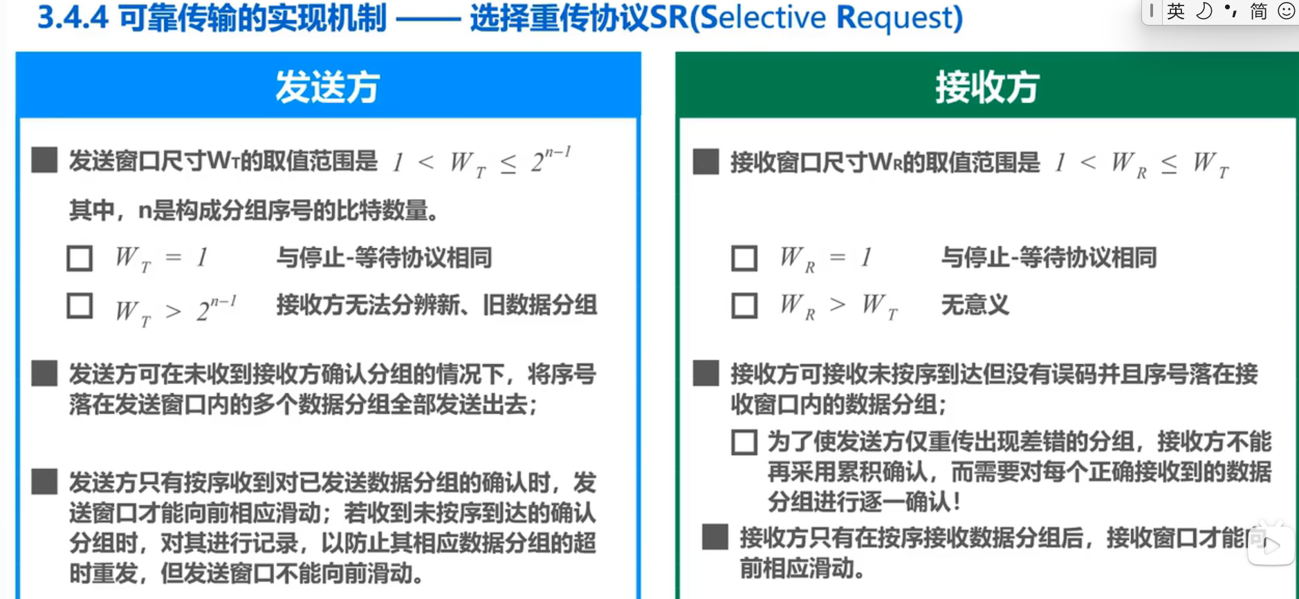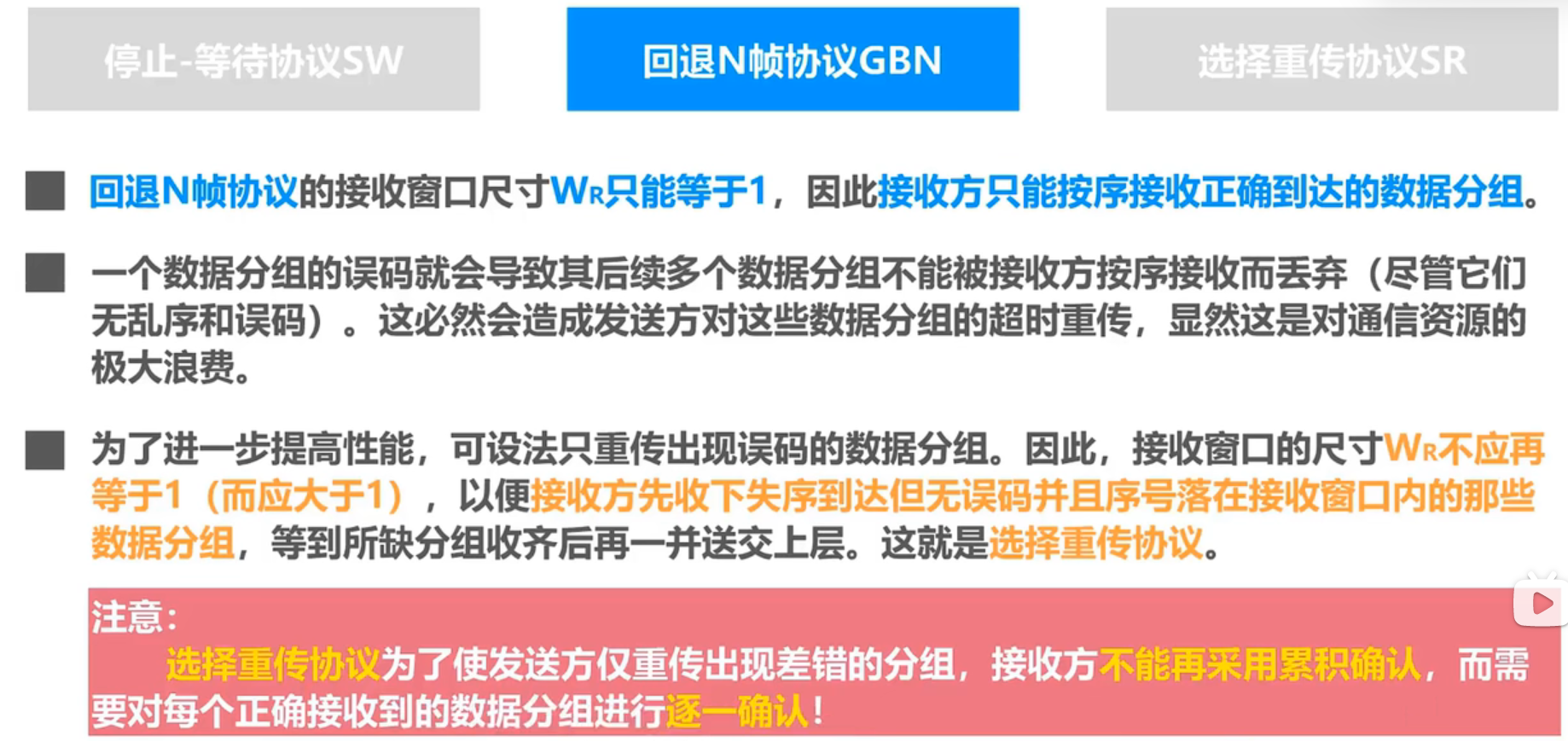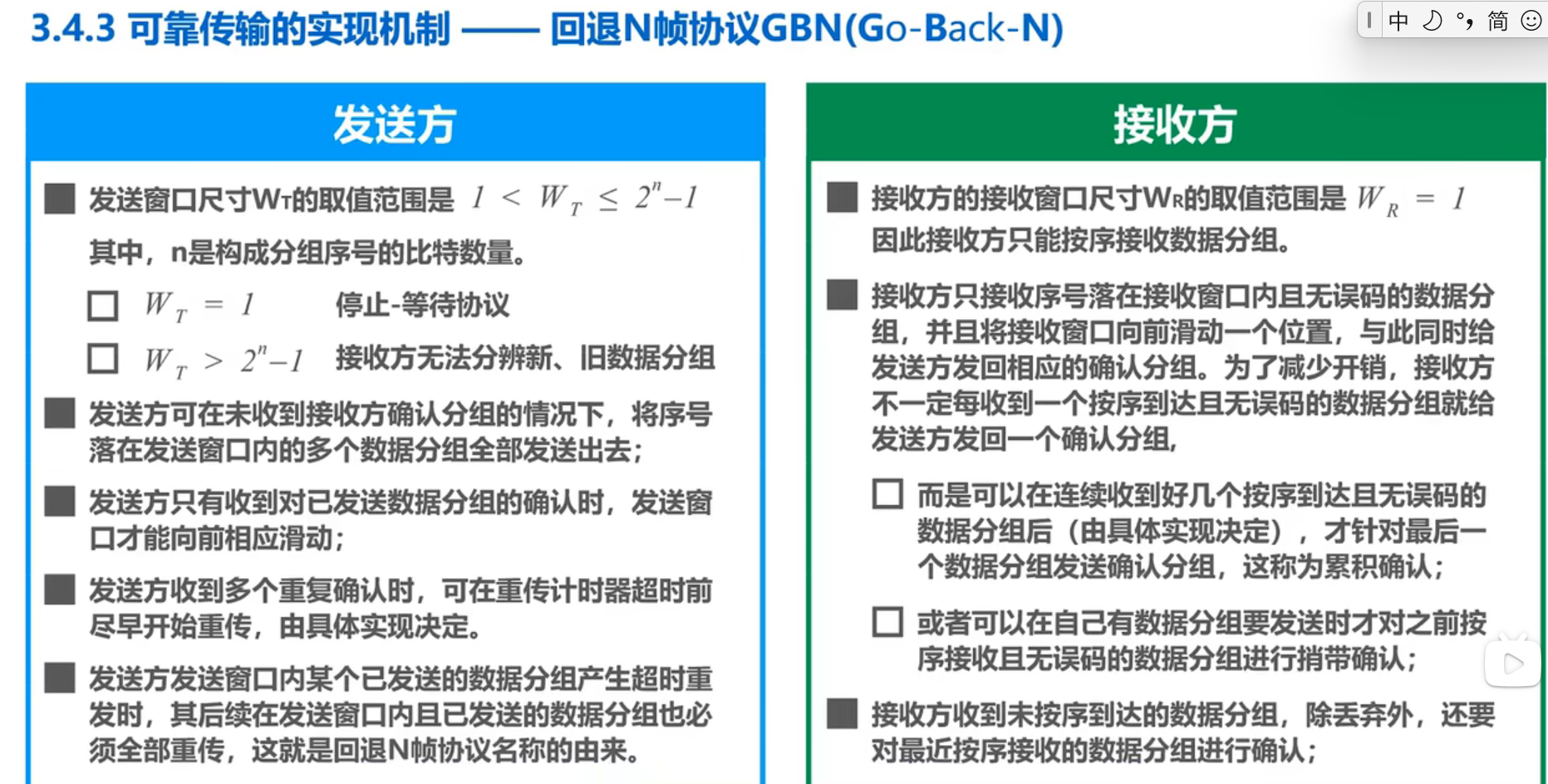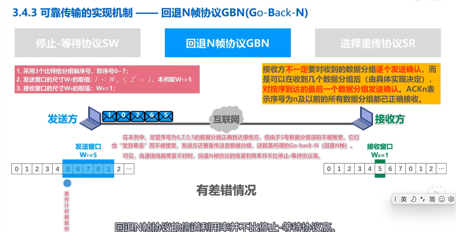 方法2:回退N帧协议:发送方一次发送发送窗口个数据,每发送完,接收方就发送发送窗口个ACK/NAK,然后往前移动发送窗口个数据.当一组数据中出现误码的时候,会连累到其他数据一起重传,回退N帧。但是在重传后接收方无法分辨新旧分组,