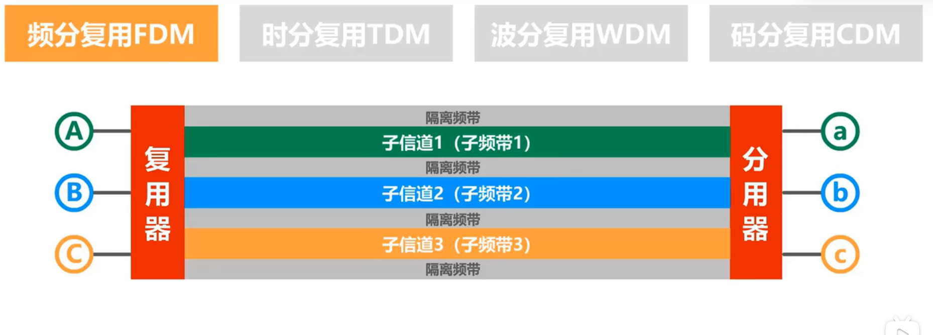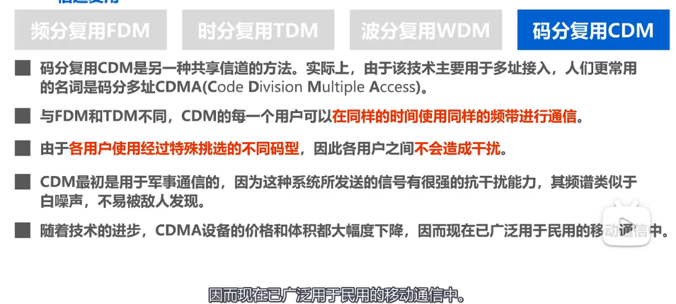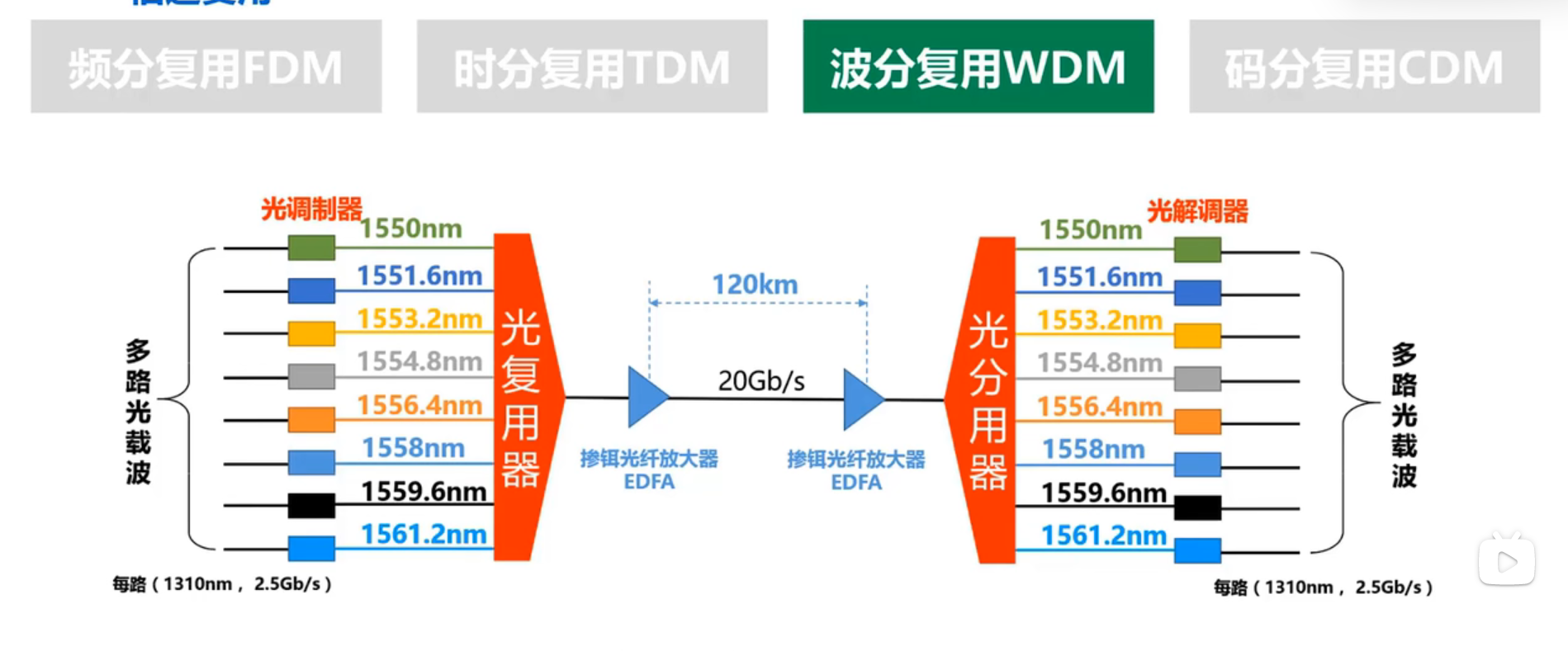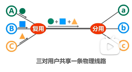 信道复用:复用就是一条信道同时传输多路用户的信号。当网络媒体的传输容量大于多条单一信道时,可利用复用技术在一条线路上建立多条通信信道来充分利用信道的带宽。