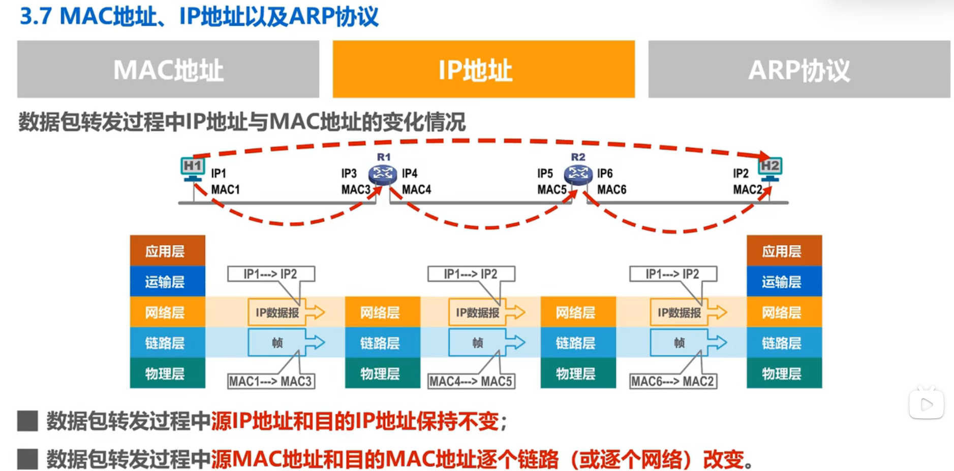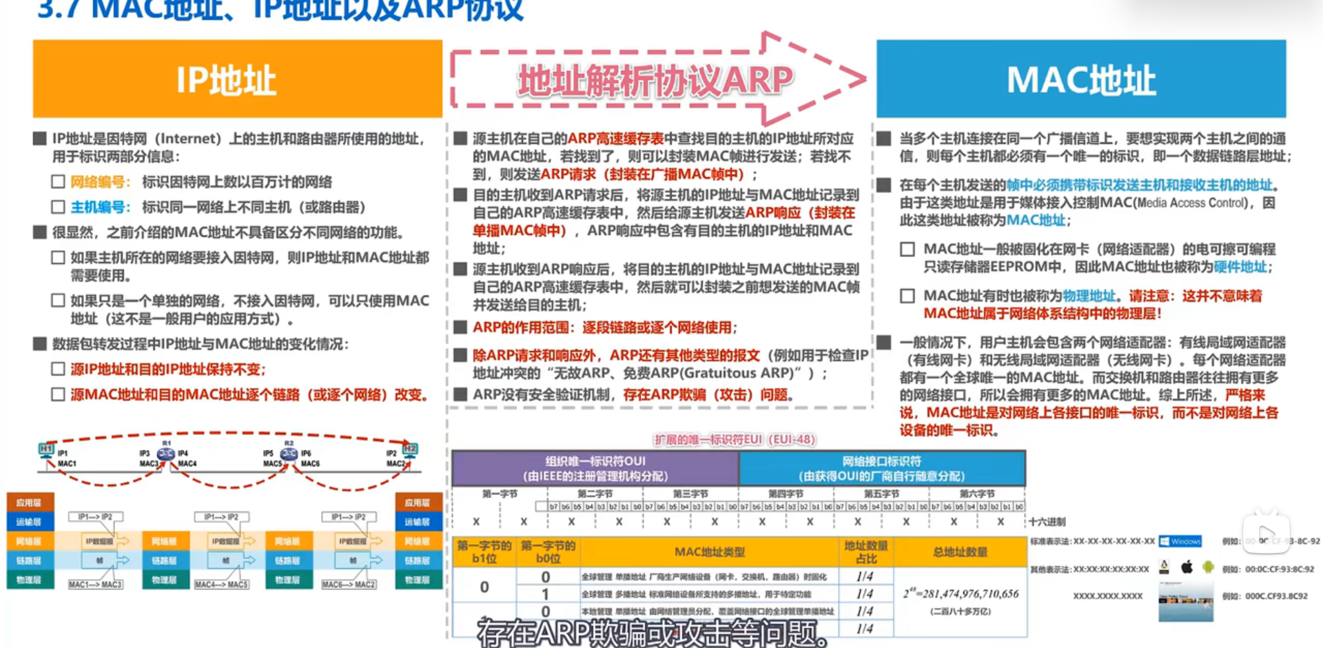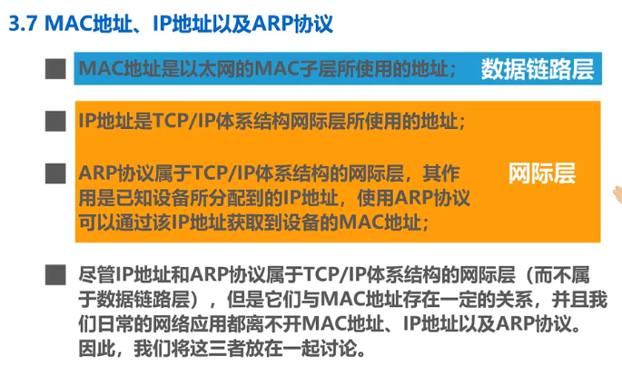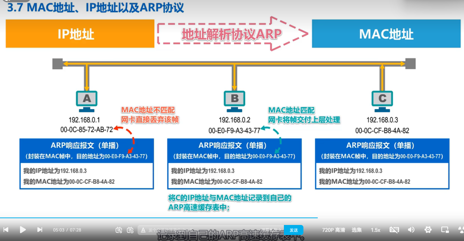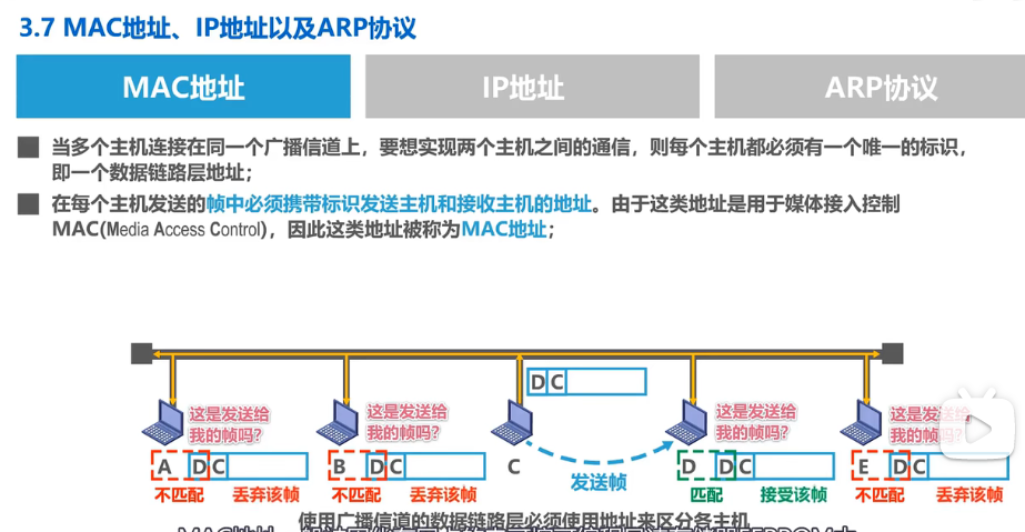 ARP:通过IP地址找MAC地址。主机B发送IP和MAC地址寻找目的主机,通过广播的方式找到了匹配的主机,其他主机收到主机B发送的帧后查对其目的IP地址,发现不匹配就把帧丢弃。目的主机C发现匹配就接受并交给上层处理,然后发送单播帧,告诉B自己的mac地址。