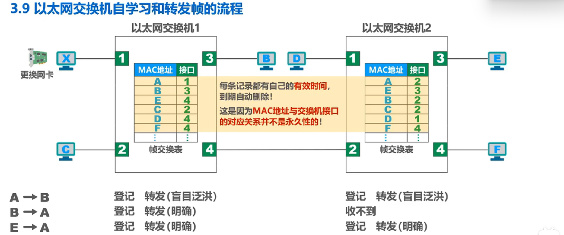 5.收到帧后,会查找帧交换表中帧的目的MAC地址所对应的接口号,然后通过该接口转发帧