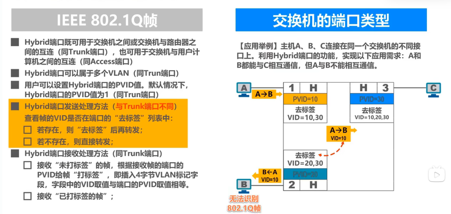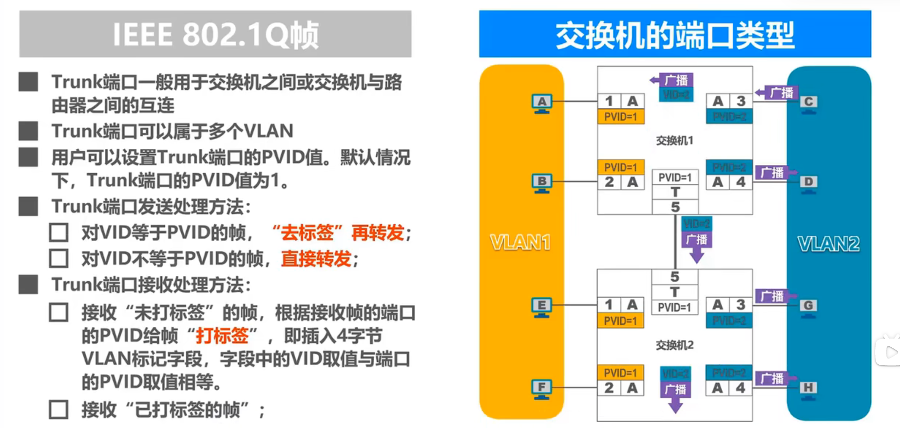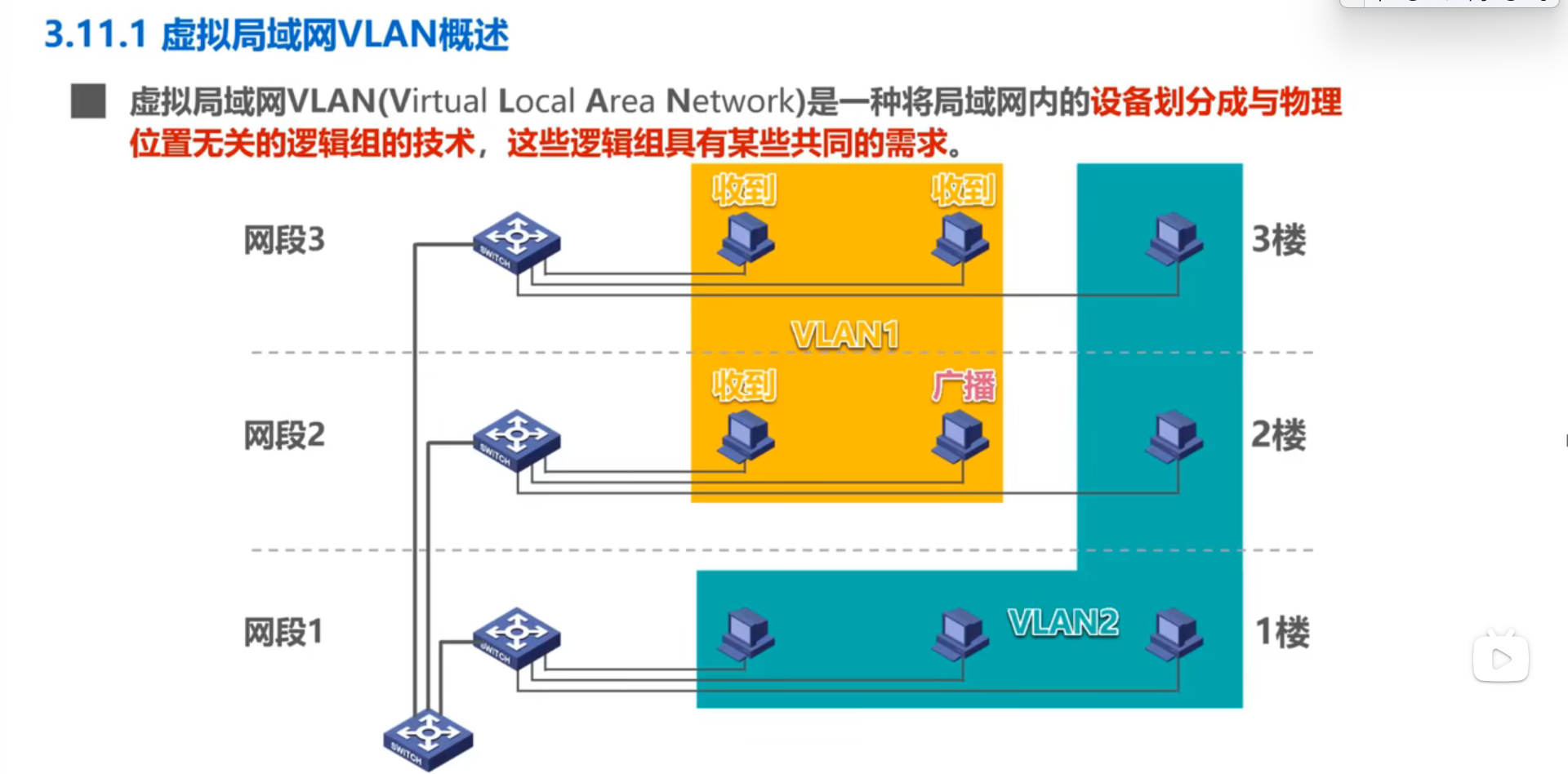 VLAN:如果主机要给其他主机发送广播信号时,会到达所有主机,这样会出现网络风暴,浪费网络资源。为了避免这个情况,把网络划分为几个组,使用VLAN技术进行隔离,同一组可以互相收到广播信号,不同组不行,这样避免浪费网络资源。这个技术是在交换机上实现的。