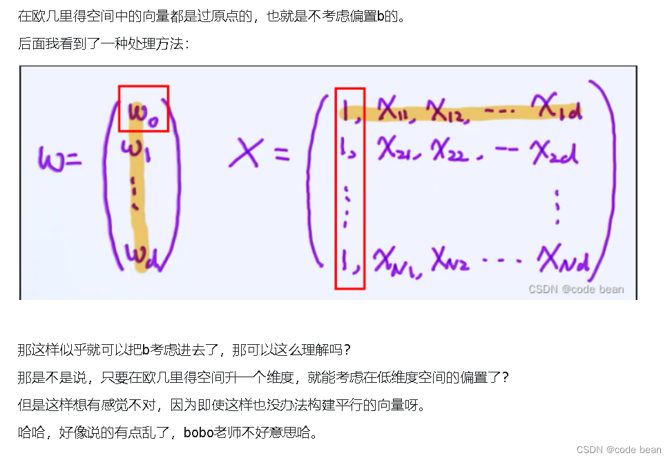 在X和W扩充一维之后,XY中的所有的点构成的空间就是一条有截距(不过原点)的直线。