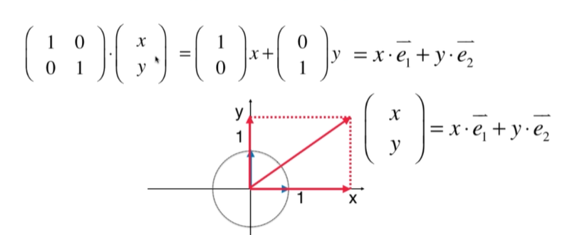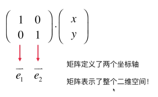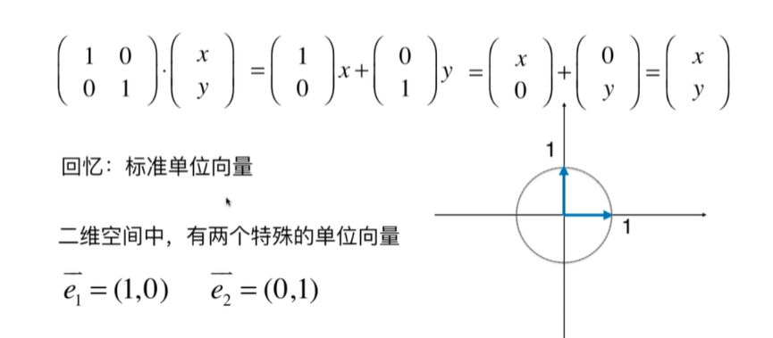 2*2的单位矩阵,就可以看成,由两个标准的单位向量构成的坐标空间!这是一个正常的没有形变的空间(单位向量表示的空间是没有形变的空)。向量 与其相乘(它乘以的是单位向量所以得到的是本身,没变)得到的就是,该向量在此空间的位置。