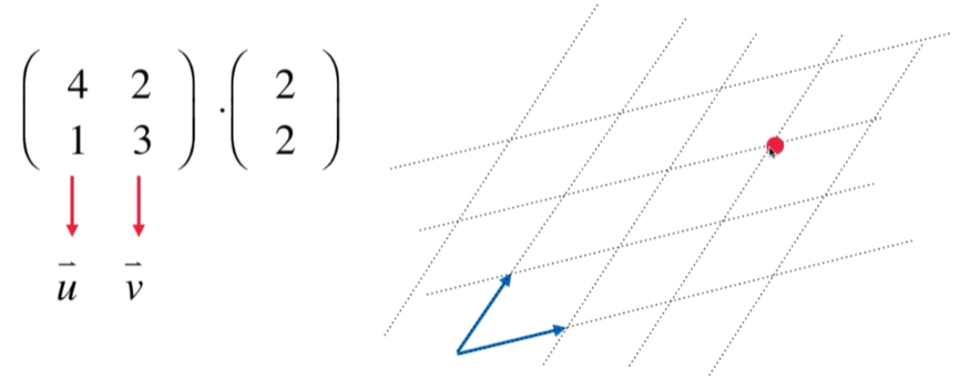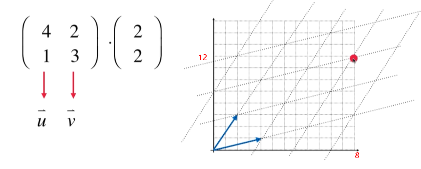 如果不把u和v看成单位向量,那么相乘就得到了在标准空间的坐标值(12, 8)!