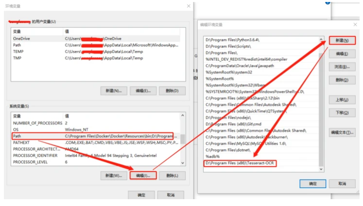 找到系统变量的 Path ,将 Tesseract-OCR 的安装目录添加进去: