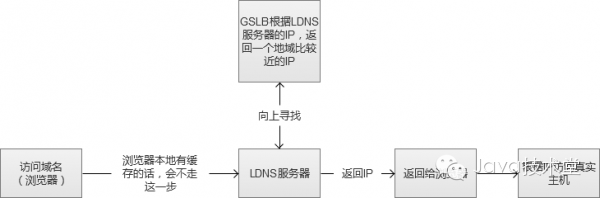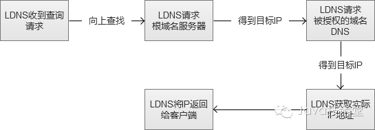 图中的“向上寻找”,实际过程是LDNS(Local DNS)先向根域名服务(Root Name Server)获取到顶级根的Name Server(例如.com的),然后得到指定域名的授权DNS,然后再获得实际服务器IP。