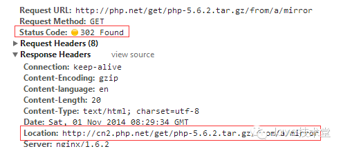 当用户发来请求的时候,Web服务器通过修改HTTP响应头中的Location标记来返回一个新的url,然后浏览器再继续请求这个新url,实际上就是页面重定向。通过重定向,来达到“负载均衡”的目标。例如,我们在下载PHP源码包的时候,点击下载链接时,为了解决不同国家和地域下载速度的问题,它会返回一个离我们近的下载地址。重定向的HTTP返回码是302,如下图: