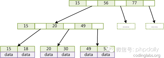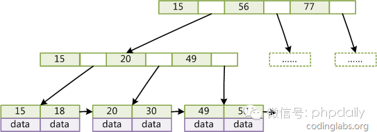 如图4所示,在B+Tree的每个叶子节点增加一个指向相邻叶子节点的指针,就形成了带有顺序访问指针的B+Tree。做这个优化的目的是为了提高 区间访问的性能,例如图4中如果要查询key为从18到49的所有数据记录,当找到18后,只需顺着节点和指针顺序遍历就可以一次性访问到所有数据节点, 极大提到了区间查询效率。