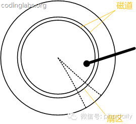 盘片被划分成一系列同心环,圆心是盘片中心,每个同心环叫做一个磁道,所有半径相同的磁道组成一个柱面。磁道被沿半径线划分成一个个小的段,每个段叫做一个扇区,每个扇区是磁盘的最小存储单元。为了简单起见,我们下面假设磁盘只有一个盘片和一个磁头。