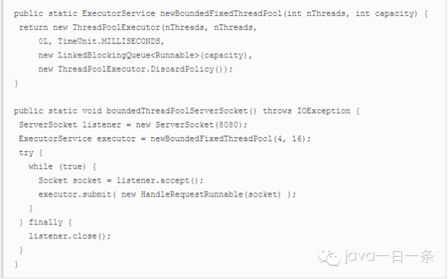 这里我们没有直接使用Executors.newFixedThreadPool方法来创建线程池,而是自己构建了ThreadPoolExecutor对象,并将工作队列长度限制为16个元素。