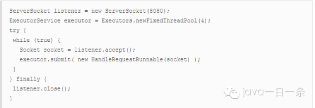 在这个示例中,没有直接创建线程,而是使用了ExecutorService。它将需要执行的任务(需要实现Runnables接口)提交到线程池,使用线程池中的线程执行代码。示例中,使用线程数量为4的固定大小线程池来处理所有请求。这限制了处理请求的线程数量,也限制了资源的使用。