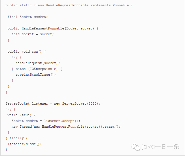 这里,accept()方法仍然在主线程中调用,但是一旦TCP连接建立之后,将会创建一个新的线程来处理新的请求,既在新的线程中执行前文中的handleRequest方法。
