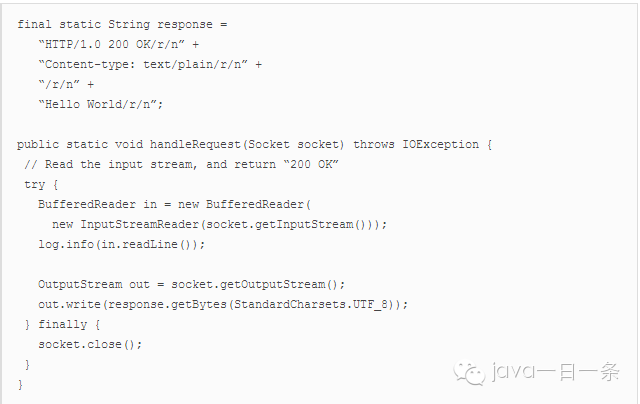 上述代码创建了一个 服务端套接字(ServerSocket) ,监听8080端口,然后循环检查这个套接字,查看是否有新的连接。一旦有新的连接被接受,这个套接字会被传入handleRequest方法。这个方法会将数据流解析成HTTP请求,进行响应,并写入响应数据。在这个简单的示例中,handleRequest方法仅仅实现数据流的读入,返回一个简单的响应数据。在通常实现中,该方法还会复杂的多,比如从数据库读取数据等。