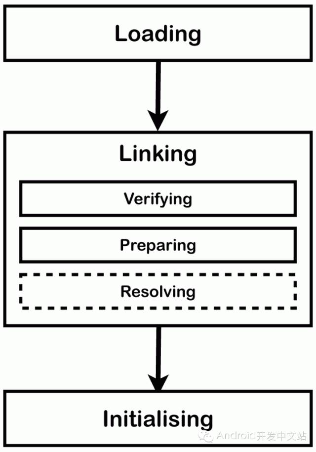 链接(Linking)是校验类或接口并准备类型和父类父接口的过程。链接过程包含三步:校验(verifying)、准备(preparing)、部分解析(optionally resolving)。