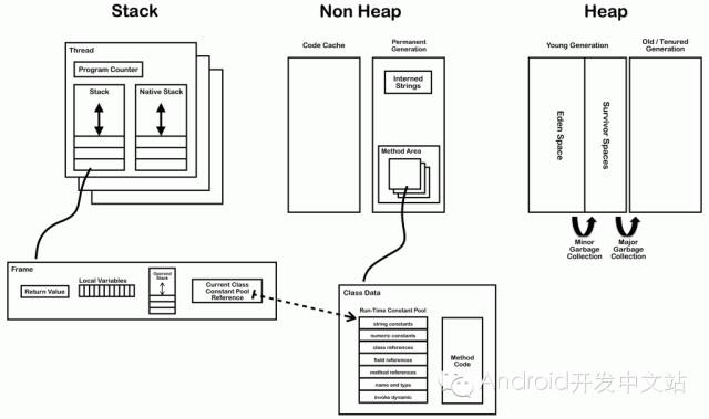 堆被用来在运行时分配类实例、数组。不能在栈上存储数组和对象。因为栈帧被设计为创建以后无法调整大小。栈帧只存储指向堆中对象或数组的引用。与局部变量数组(每个栈帧中的)中的原始类型和引用类型不同,对象总是存储在堆上以便在方法结束时不会被移除。对象只能由垃圾回收器移除。