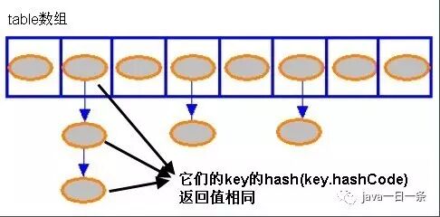 key-value 对(就是 Entry 对象)的存储位置。当两个 Entry 对象的 key 的 hashCode() 返回值相同时,将由