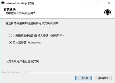1) 从网盘获得 Remix-Desktop-Setup-1.1.5.exe,双击启动,点击下一步: