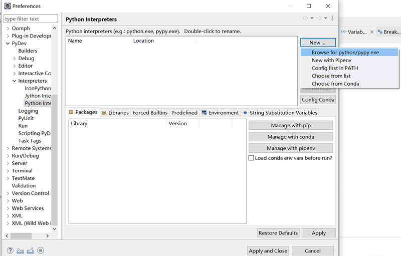 再依次选择 Pydev > Interpreter >Python Interpreter,在此配置 Python。如下图所示: