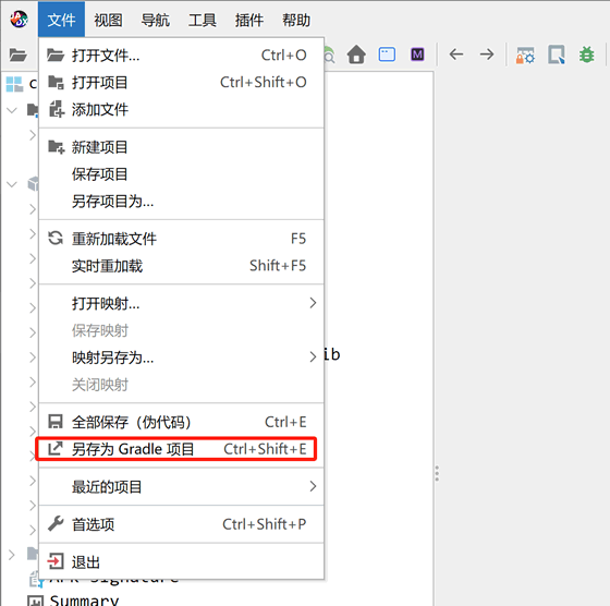 1) 在 Jadx 图形界面中,点击“文件”菜单,选择“另存为gradle项目”选项: