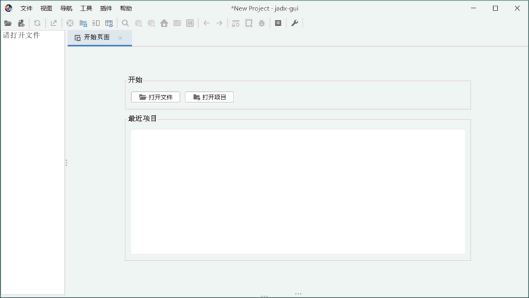 解压成功下载的 JADX 压缩包,双击运行 jadx-gui-1.5.3.exe。正常会看到 JADX 的主界面,如下图所示: