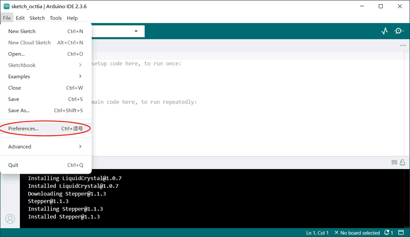 正常启动 Arduino IDE,界面默认是英文的,如下图所示: