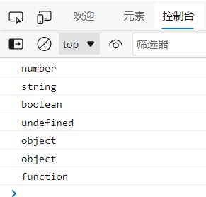 // number let d = 5; console.log(typeof d); // string let s = 'string'; console.log(typeof s); // boolean let b = true; console.log(typeof b); // undefined let u; console.log(typeof u); // Object null let obj1 = null; console.log(typeof obj1); // Object 自定义 let obj2 = {name:"obj",age:18}; console.log(typeof obj2); // function function func() {}; console.log(typeof func);