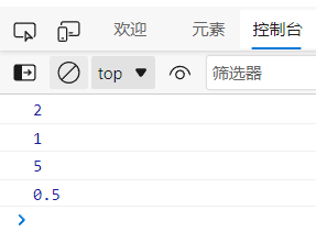 let a=1; a+=1; console.log(a); a-=1; console.log(a); a*=5; console.log(a); a/=10; console.log(a);![]()