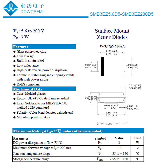 3)SMB/DO-214AA封装,SMB3EZ5.6D5-SMB3EZ200D5