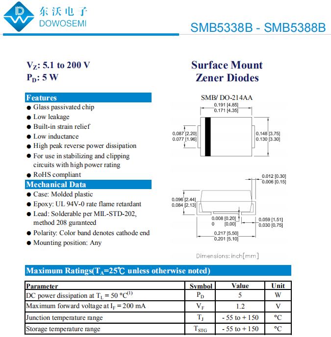 2)SMB5338B-SMB5388B,SMB/DO-214AA封装,稳压值5.1V to 170V,具体型号有:
