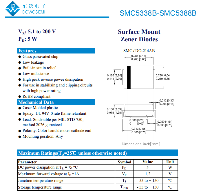 3)SMC5338B-SMC5388B,SMC/DO-214AB封装,稳压值5.1 V to 200V,具体型号有:
