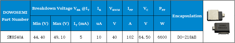 举个例子,“SM8S40ATHE3/I”这个料号,懂行的一看就知道这个汽车级贴片TVS二极管出自国际知名品牌VISHAY威世。那么关于SM8S40ATHE3/I这个料,有没有国产对应的料号取代它呢?国产贴片TVS管品牌厂家哪家好呢?不可否认,国内二极管制造技术已经非常成熟了,对质量把控非常地严格,可以直接pin-to-pin替代国际品牌对应的TVS料号。东沃DOWO品牌的SM8S40A可直接pin-to-pin VISHAY威世SM8S40ATHE3/I。