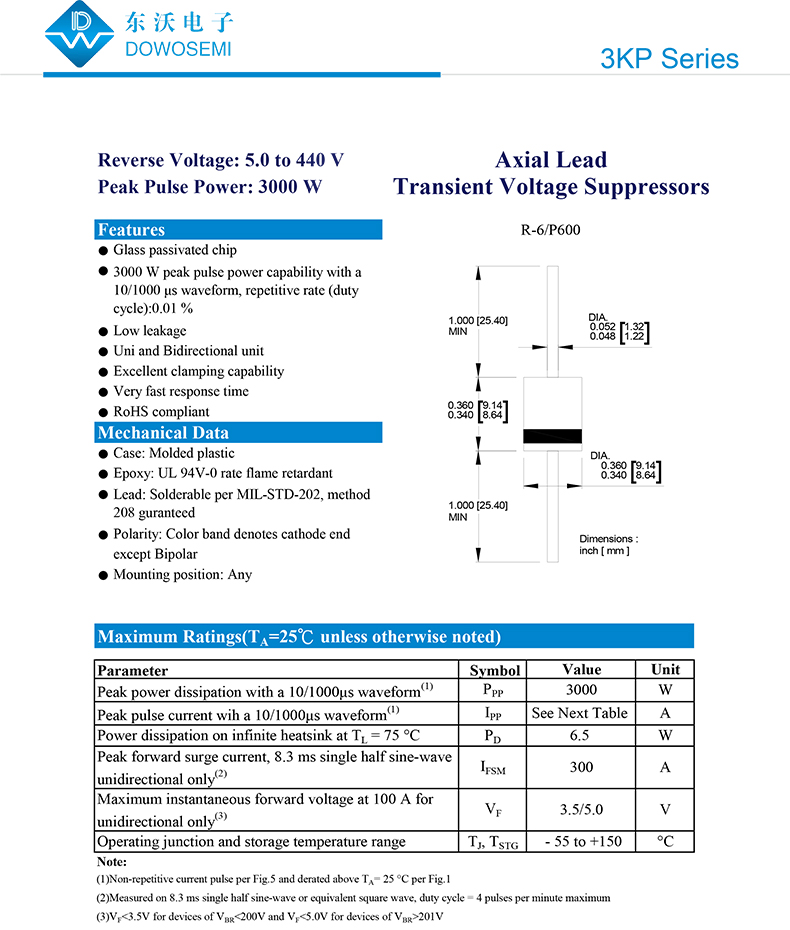 直插TVS二极管3KP系列,功率3000W,R-6/P600封装