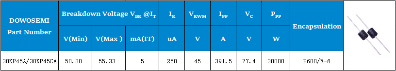 TVS瞬态抑制二极管选型,不仅需要丰富的理论知识,而且还需要强大的实践经验来支撑。TVS二极管选型过程中,需要涉及到TVS的工作电压、击穿电压、钳位电压、峰值脉冲电流、峰值脉冲功率、漏电流等参数,而这些参数的选择,是要根据被保护电路的工作电压和电流情况来选择的。关于30KP45A和30KP45CA大功率TVS二极管参数,如下: