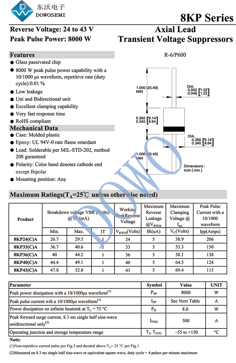 8KP系列TVS,封装R-6/P600,同类型封装瞬态抑制二极管还有3KP系列、5KP系列、15KP系列、20KP系列、30KP系列,对应功率分别是:3000W、5000W、15000W、20000W、30000W,型号齐全,具体参数详情,详见对应产品手册,感兴趣的新老电子工程师可直接向东沃电子索取。