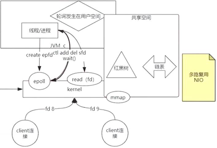 内核通过mmap实现共享空间,用户态和内核态有一个空间是共享的,文件描述符fd存在共享空间实现用户态和内核态共享。epoll里面有三个调用,用户空间先epoll_create准备一个共享空间mmap,里面维护一个红黑树,内核态将连接注册进红黑树,epoll_ctl写入。当有数据准备好了,调用epoll_wait中断阻塞,取链表fd,再单独调用read。
