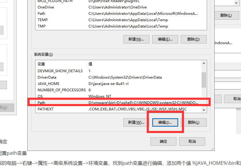 我的电脑-->右键-->属性-->高级系统设置-->环境变量,找到path变量进行编辑,添加两个值 %JAVA_HOME%\bin和