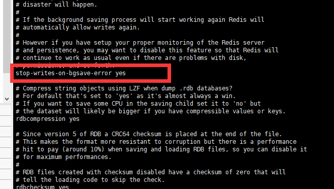 stop-writes-on-bgsave-error Redis无法写入磁盘中,直接关掉redis的写操作,推荐 yes