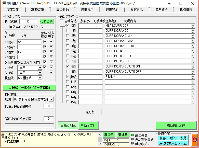 可以预先编辑很多条要发的码存起来,一次选中多条码发送,非常方便连续测试。