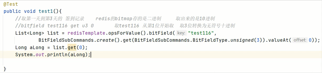 List<Long> list 之所以是list是因为BitFieldSubCommands可能是多条命令,但是本例中list只有一个值