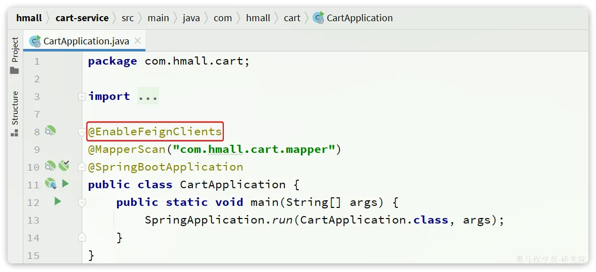 接下来,我们在cart-service的CartApplication启动类上添加注解,启动OpenFeign功能: