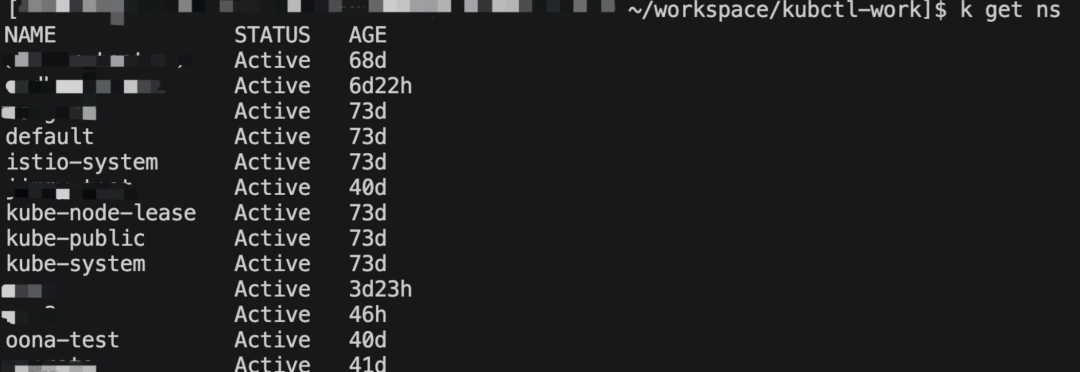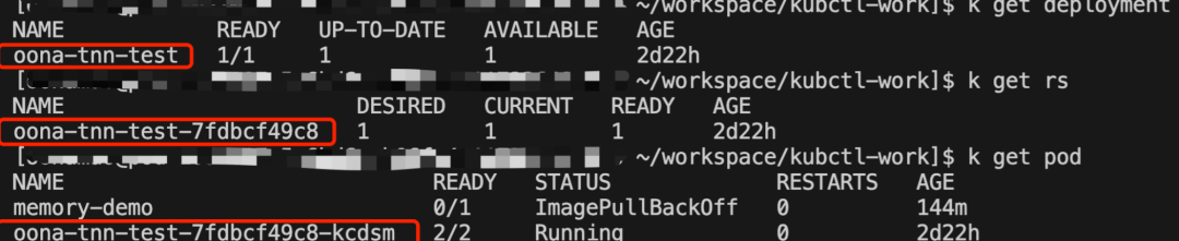 于是,只需要通过 -n=${NAMESPACE} 就可以指定自己要操作的资源所在的 namespace。比如查看 Pod: kubectl get pod -n=oona-test ,同理,查看 Deployment: kubectl get deployment -n=oona-test 。