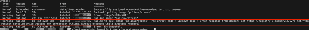 哎,我们看到之前部署的 Pod 服务 memory-demo 显示的“ImagePullBackOff”是怎么回事呢?先不着急,我们慢慢看下去。