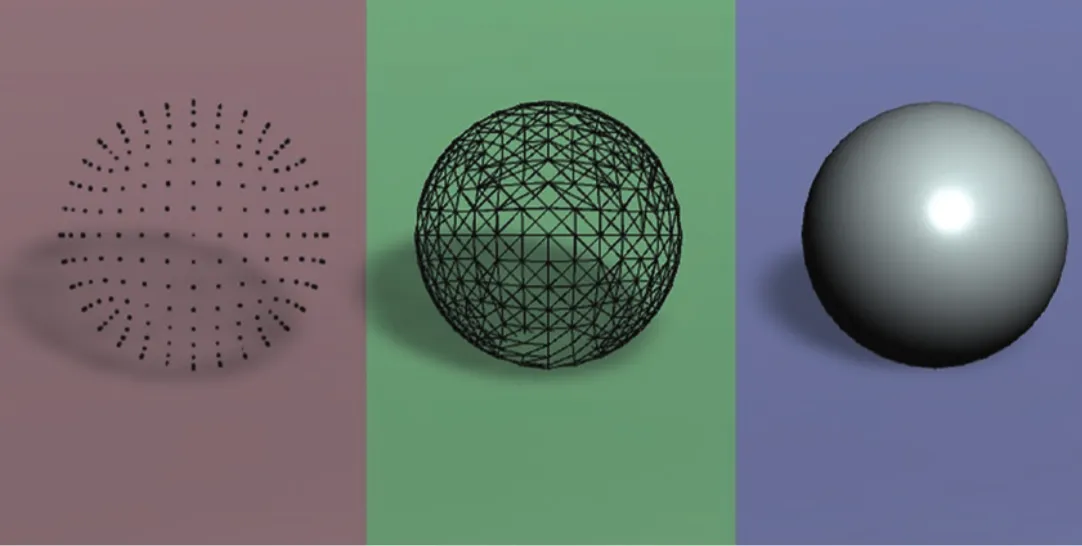 网格的不同成分的示例:从左到右是顶点、边、面 网格是游戏图形中最重要的概念之一,它是由顶点、边和面组成的数据结构。顶点是网格的点,边是连接两个顶点的线段,面是三个或更多顶点组成的多边形。网格可以由三角形、四边形、五边形等组成。