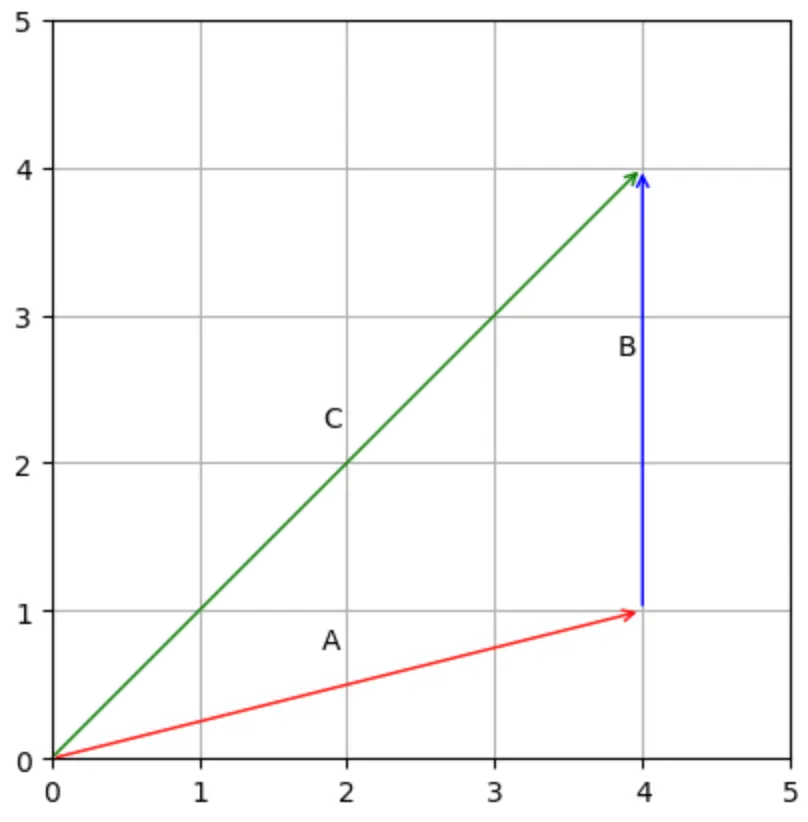 向量加法是两个向量的和,即起点和终点相加。例如,向量A = (4,1),向量B = (0,3),那么向量C=A + B = (4+0,1+3)=(4,4)。