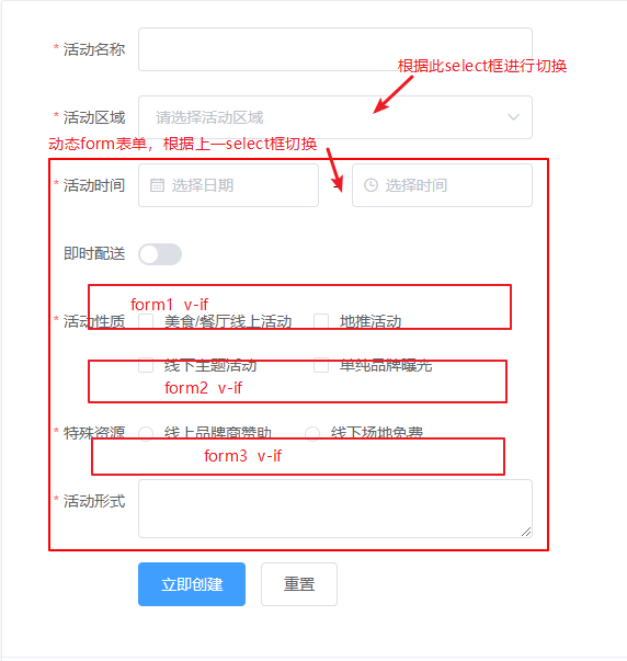 例如通过“活动区域”选项,动态决定下方的form内容,所有form用v-if做判断。当利用rules和validate做上传校验时,出现第一张form校验失败的提示项,在切换select框内容后仍然会出现在其他表单上,且位置对不上。