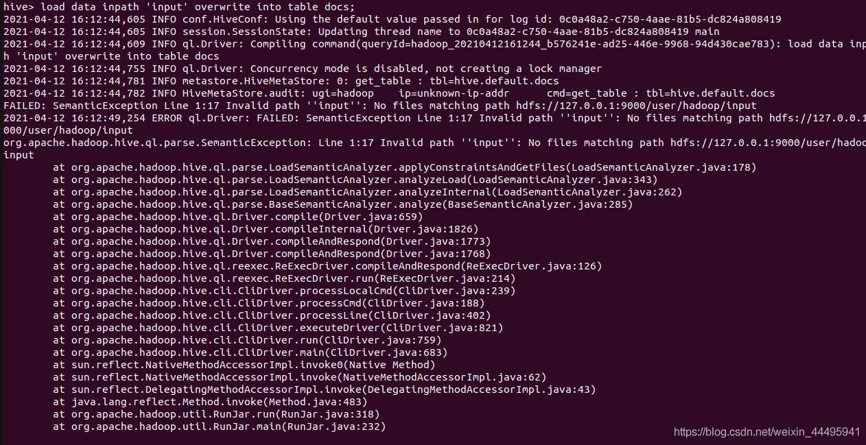 解决方法二:先将本地文件上传至hdfs,然后使用 load data inpath [hdfspath] [overwrite] into table table_name.